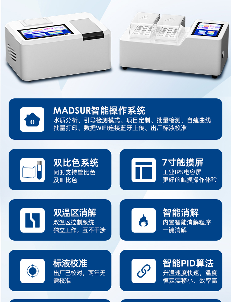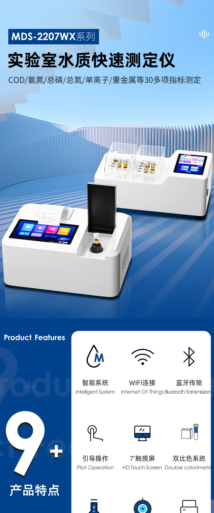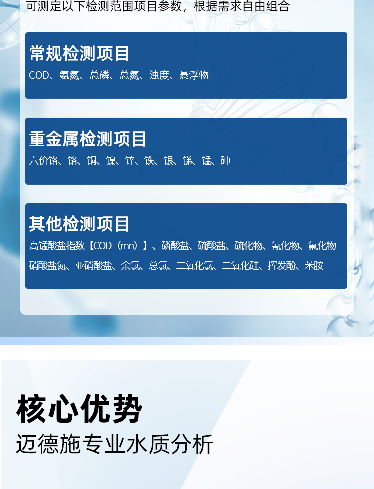 支持COD、氨氮、總磷、總氮、單離子、重金屬等30多項指標(biāo)測定。