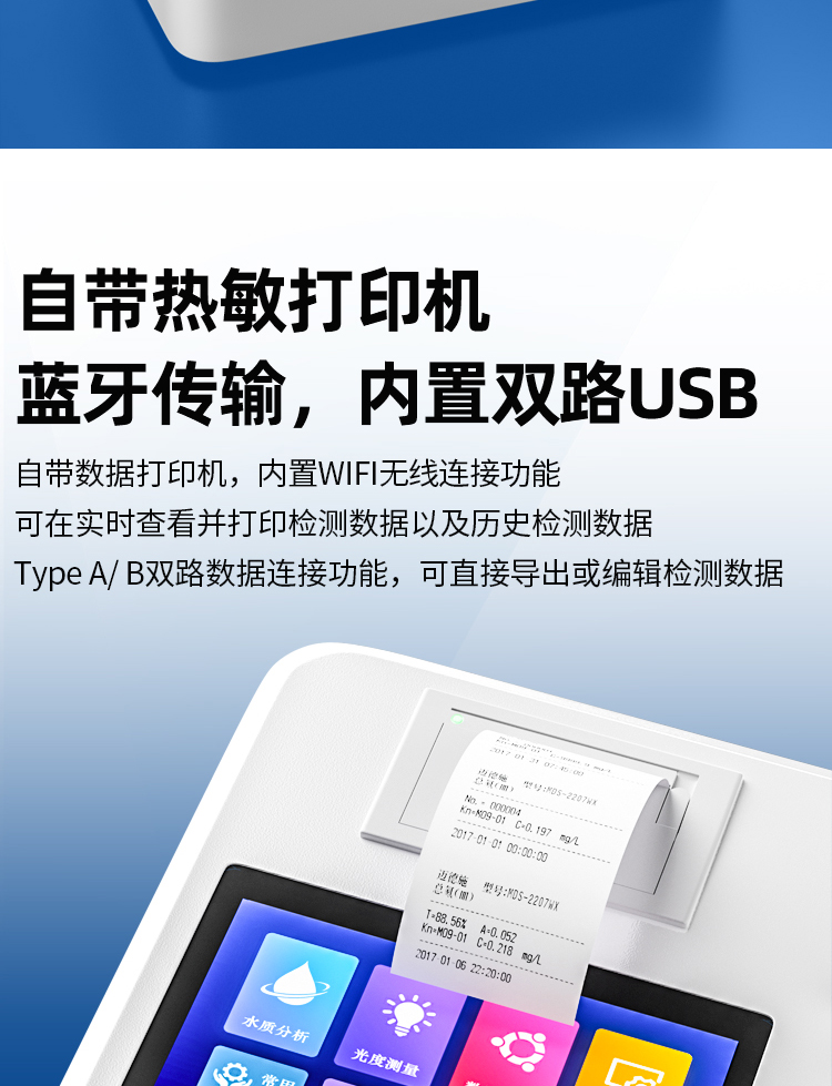 內(nèi)置雙路USB(TypeA、TypeB)數(shù)據(jù)連接功能,可直接導(dǎo)出或編輯檢測數(shù)據(jù)。