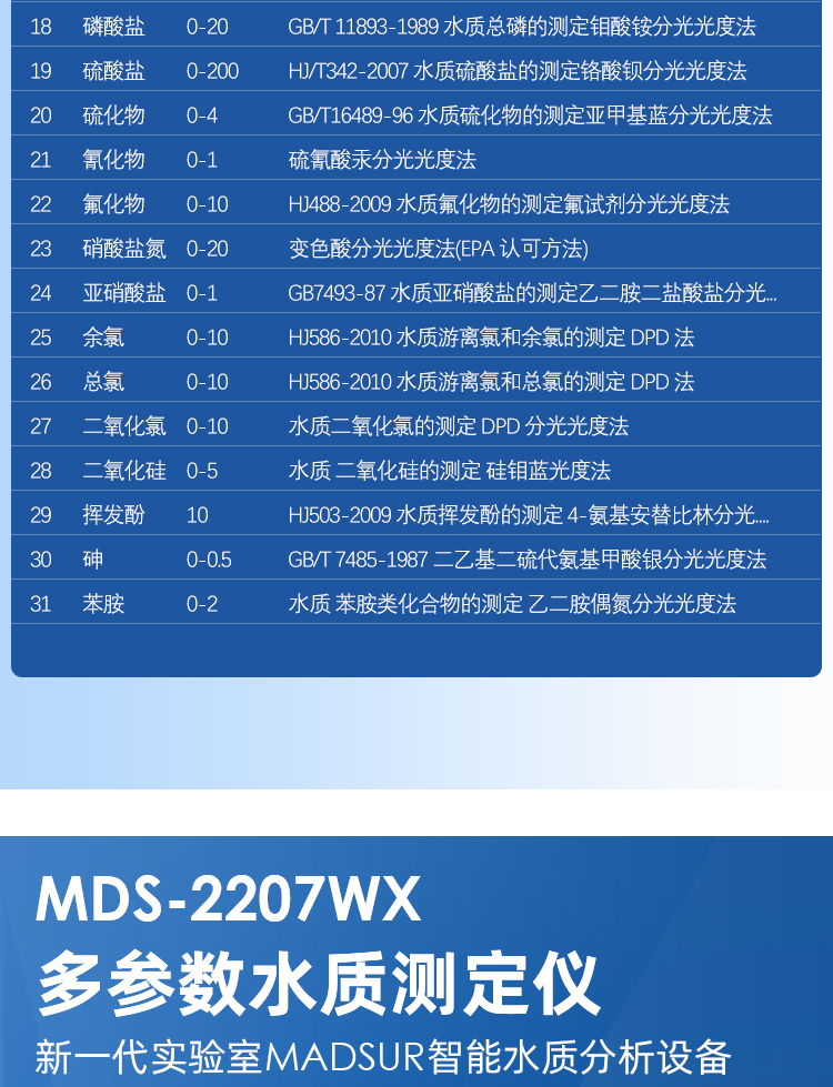 MDS -2207WX 型多參數(shù)水質(zhì)快速測定儀,基于國家檢測標(biāo)準(zhǔn)(GB)及環(huán)境部檢測標(biāo)準(zhǔn)(HJ)研發(fā)生產(chǎn)。儀器采用工業(yè)級IPS7寸電容觸摸屏,數(shù)據(jù)直觀,操作方便;檢測裝置采用進口光學(xué)檢測比色系統(tǒng),并搭載我司自主研發(fā) MADSUR?水質(zhì)智能檢測系統(tǒng);使得儀器的穩(wěn)定性、壽命、檢測精準(zhǔn)度跨越性提高;MADSUR?水質(zhì)智能檢測系統(tǒng)是基于國人操作習(xí)慣的理念開發(fā)而成,操作簡單快速;無 需專業(yè)人員即可輕松操作;真正做到:讓檢測更簡單!廣泛應(yīng)用于企業(yè)污水檢測、環(huán)境監(jiān)測站、科研單位、高校、河流污染監(jiān)察等水質(zhì)快檢領(lǐng)域。